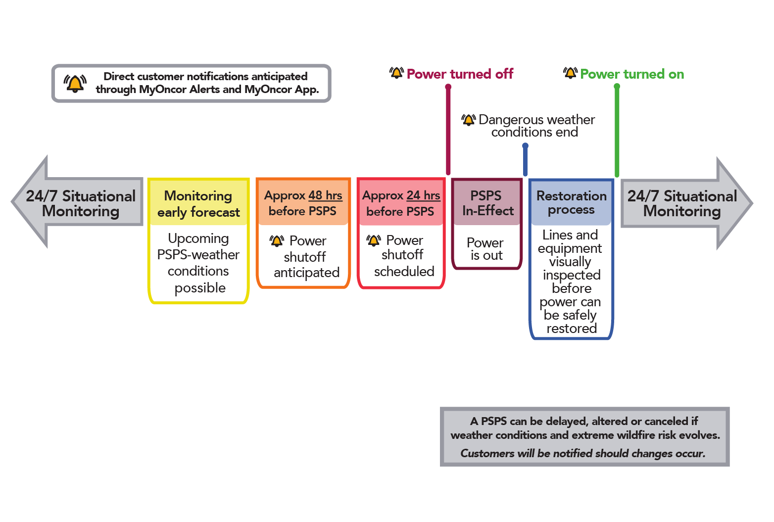 Oncor will aim to provide advance notice to customers located in areas where a PSPS is being considered. We will strive to notify customers via MyOncor Alerts approximately 48 and 24 hours in advance, in addition to sending impacted customers a notification as the PSPS is implemented. Oncor will continue to provide updates throughout the PSPS event until all impacted customers have been restored. Additionally, Oncor will share updates about PSPS events at oncor.com/psps and at our online newsroom, The Wire.
